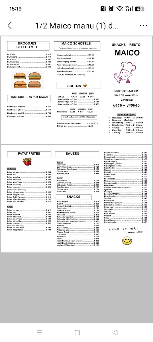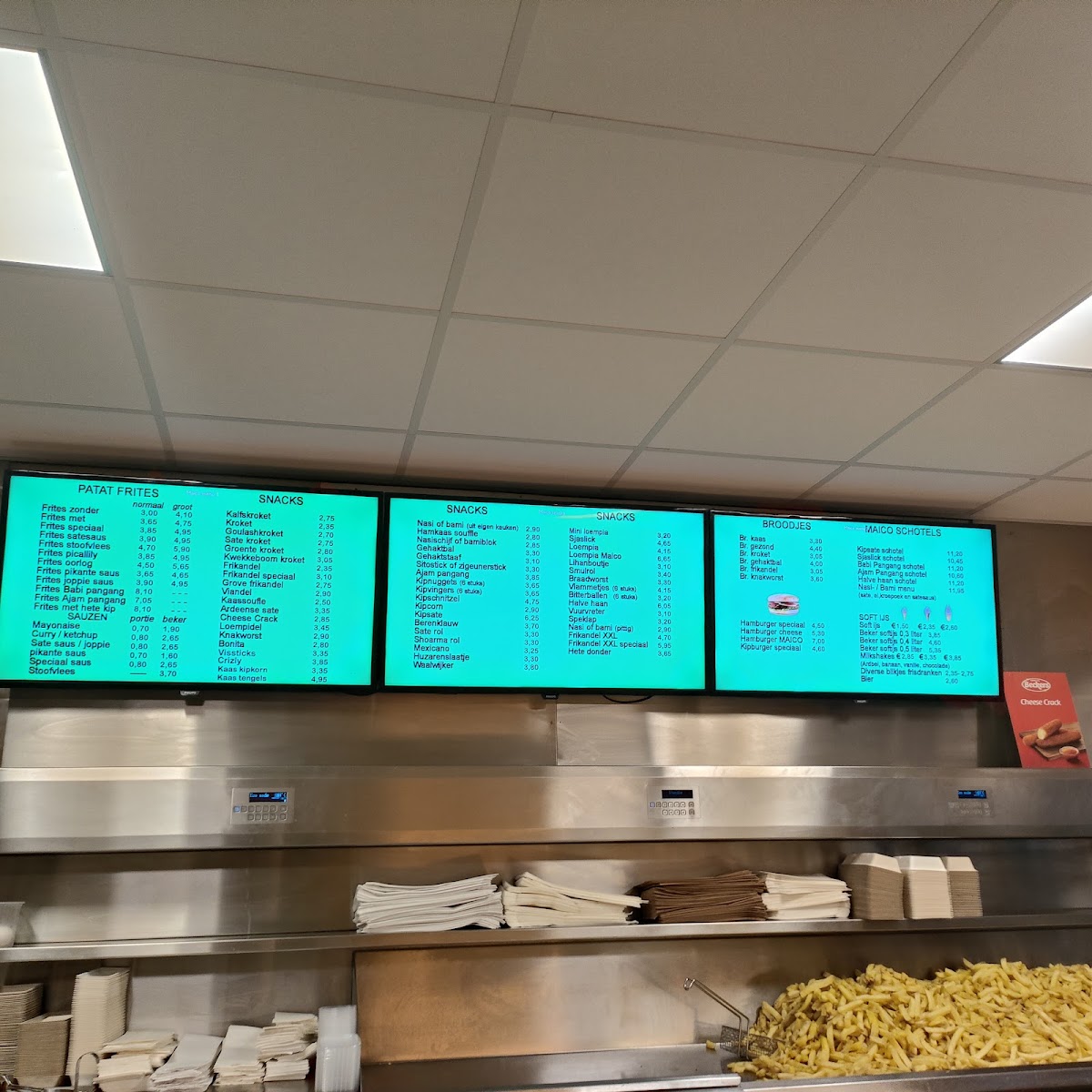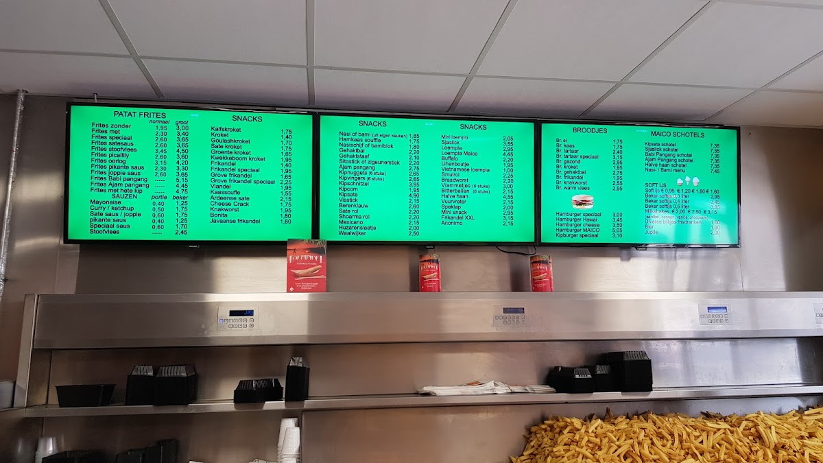The menu at Snackbar Maico offers straightforward, familiar Dutch fast food in a relaxed, no-fuss setting. It focuses on simple, satisfying bites that are perfect for a quick meal or casual snack. You’ll find classic choices like friet speciaal, saté-saus drizzled over crispy fries, and popular finger foods such as frikandel speciaal and vlammetjes.